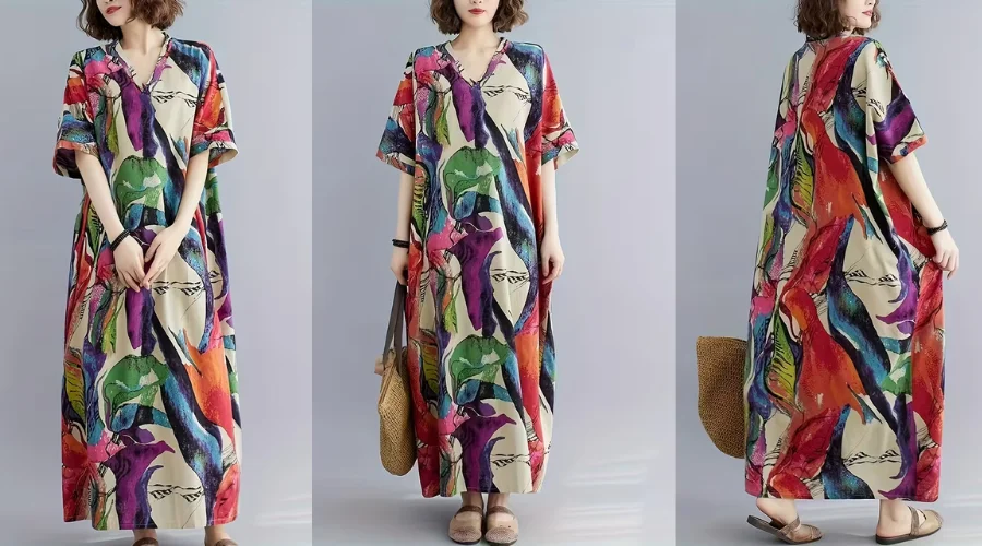 The Boho dress with Kaftan style is the perfect embodiment of some of the best summer holiday dresses for women. It has an eye-catching Black & white color block design and gives easy elegance to your overall look. The V-neck renders a flattering touch, while the short sleeves and relaxed fit make sure to lend comfort throughout the day. For the beach day out wear this dress along with your slippers, hat, and huge bag to carry your necessities. The laid-back vibe is completed with the slit in the dress. For an evening breezy environment add a shrug or coat with it. The Bohemian vibe and gorgeous appearance are assured with this Temu Dress.